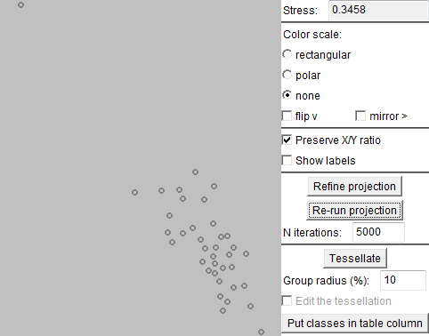 In the images below, we have applied Sammon's mapping to the matrix of distances between 37 eye trajectories. The trajectories are represented by dots (small circles). One trajectory is positioned far from the others, which means that its shape is very dissimilar to the shapes of the other trajectories. The presence of this outlier in the projection complicates the consideration of the remaining points since they are positioned very close to each other. Using the projection, we separate the outlying trajectory from the rest. For this purpose, we divide the projection plot into two regions, which define two classes of trajectories: one consists of the outlying trajectory and the other includes all the rest.